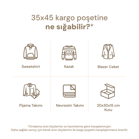 Kargo poşetlerinde üretimden kaynaklı olarak 2 (±)  cm kadar farklılık olabilir.