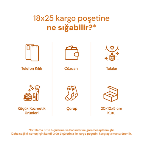18x25+5 cm ölçüsünde turuncu renkli, cepsiz ve kendinden yapışkanlı (bantlı) kargo poşetidir. Toplu olarak alabileceğiniz kargo poşeti ile kargo gönderim işlemlerinde çok daha fazla tasarruf elde edebilirsiniz. Farklı ebatlarda kargo poşetleri her türlü ihtiyacınıza ve yoğun kargo içeriğinize göre düzenlenmiş olup, talebinize uygun poşet ebatını bulmanız mümkündür.