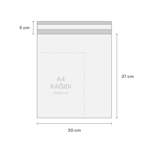 30x37+5 cm ölçüsünde ön yüzü şeffaf arka yüzü siyah, cepsiz ve kendinden yapışkanlı (bantlı) kargo poşetidir.
