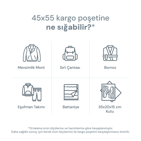 Kargo poşetlerimizde üretimden kaynaklı olarak 2 (±) cm kadar farklılık olabilir.